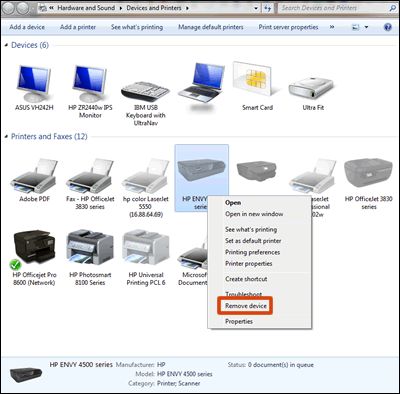 断开电脑上的打印机 USB 连接线。在驱动程序安装过程中如果未出现提示,请勿重新连接连接线。 在 Windows 中搜索“设备”,然后在结果列表中点击设备和打印机控制面板设置。 右击打印机型号图标,然后点击“移除设备”。如果显示多个打印机图标,请全部移除。 图片 : 从“设备和打印机”中移除打印机