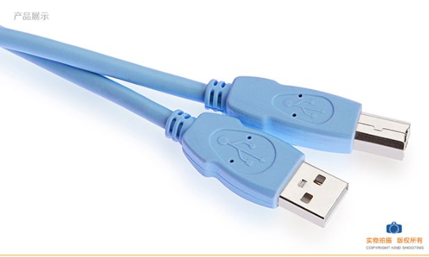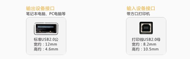 USB/公端子插入笔记本电脑或PC电脑等输出设备对应接口,另一端B公端子出入方口和相同方口的产品等输入设备连接口之间的数据传输。